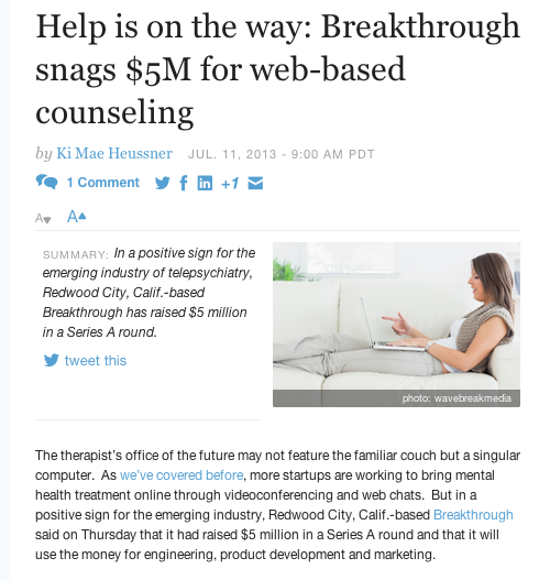 As it turns out, I love technology and social media. To that end, I have developed 3 blog sites, 4 websites, and have done employee assistance work and executive coaching over the internet in a total of 15 countries around the world. There have been many advances in the technology that make TeleMental Health Services viable. Research is now beginning to demonstrate the benefits and outcomes of TeleTherapy. The studies are coming out quite positive and encouraging. There are now Distance Counseling Credentials, Certifications in online therapy and forums for creating an online practice. As you can see on this blog, I have a special connection that provides a direct link to a video counseling session. The article below is a good example of the trend.