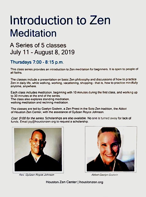 Zazen, which means sitting meditation. If you have ever been interested in learning to meditate, you can’t find better teaches than those being offered at the Houston Zen Center. Link to: Houston Zen Center.